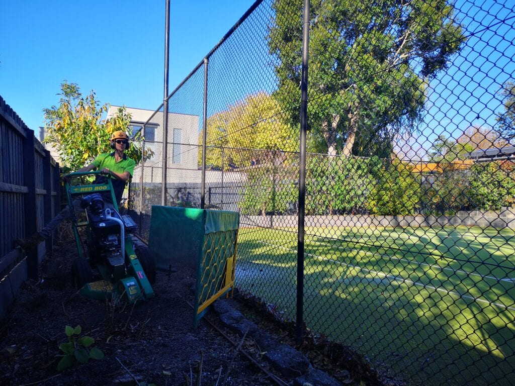 The job involved removing approximately ten Frangipani stumps as deep as possible to allow for replanting. The stumps were located along the back fence line of the property tucked behind a tennis court. There were several challenges we had to overcome to get our machine to the tree stumps including protecting some nice paving and traversing down some large steps.